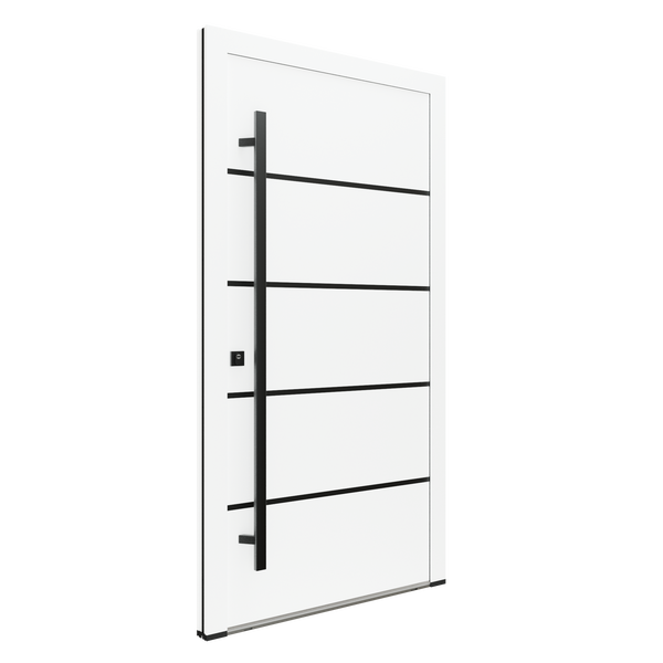 Die Eingangstür Jakob in Weiß besticht durch ihre Schlichtheit und ihren modernen Stil. Die horizontalen Blackline-Applikationen und der rechteckige schwarze Türgriff unterstreichen den minimalistischen und eleganten Charakter des Modells.