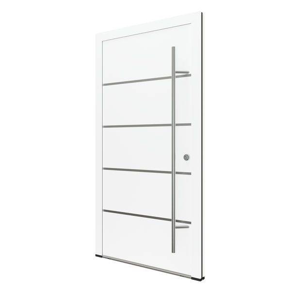 Die Eingangstür Jakob in Weiß verbindet eine solide Konstruktion mit einem eleganten Stil. Der runde Edelstahlgriff und die horizontalen Applikationen aus Edelstahl verleihen ihr Langlebigkeit und ein modernes Aussehen, das zu verschiedenen Fassaden passt.