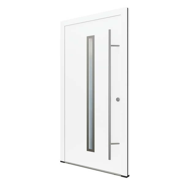 Die Eingangstür Leon in Weiß verleiht der Fassade des Hauses Helligkeit und Eleganz. Die schmale vertikale Verglasung mit satiniertem Glas und der runde Edelstahlgriff bilden eine moderne und leichte Lösung.