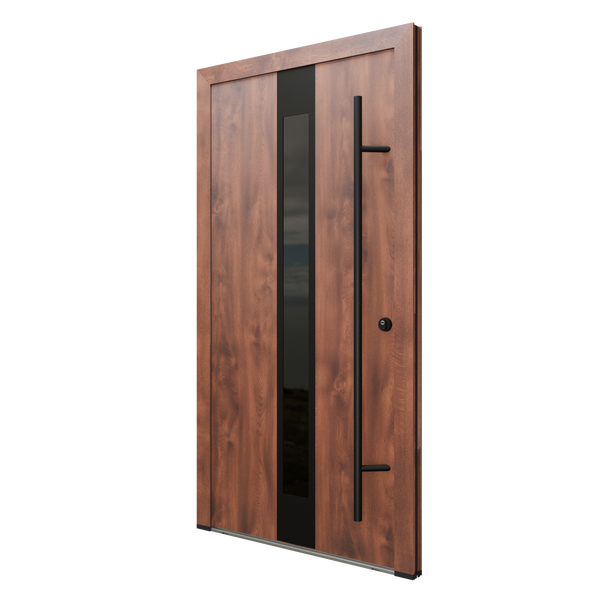 Die Eingangstür Thomas in Nussbaumoptik zeichnet sich durch ihre Robustheit und ihren ausdrucksstarken Stil aus. Die graphitfarbene Scheibe in vertikaler Verglasung, der runde schwarze Türgriff und die Blackline-Applikationen unterstreichen ihre Langlebigkeit und ihr modernes Aussehen.