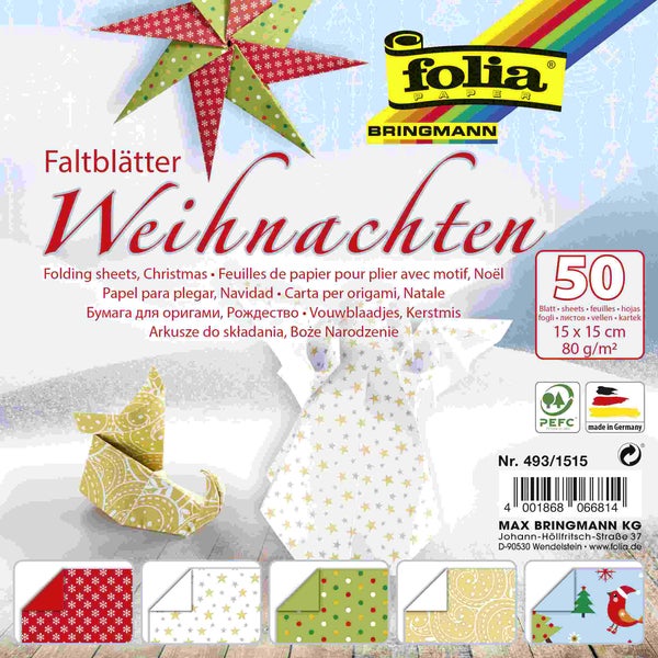 Faltblätter 80g/qm, 50 Blatt in der Größe 15x15cm, in weihnachtlichen Motiven sortiert, verpackt im Polybeutel mit 4-farbig bedrucktem Deckblatt, LGA tested, Made in Germany