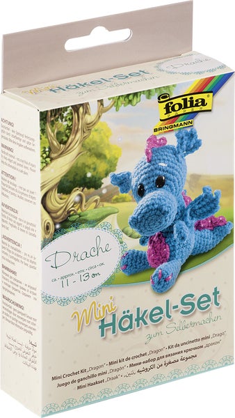 Mini-Häkelset Drache, komplettes Set zur Herstellung eines selbstgehäkelten Drachens ca. 12 - 14 cm groß, Inhalt: 1 Häkelnadel, 15 g Wolle türkis, 5 g Wolle magenta mit Glitter, 2 Sicherheitsaugen 6mm, 10 g Füllwatte, 1 ausführliches Anleitungsheft 4-farbig, Wolle aus 45% Baumwolle & 55% Polyacryl, Garn aus 100% Baumwolle, Füllwatte aus 100% Polyester, verpackt in einer 4-farbigen Faltschachtel.