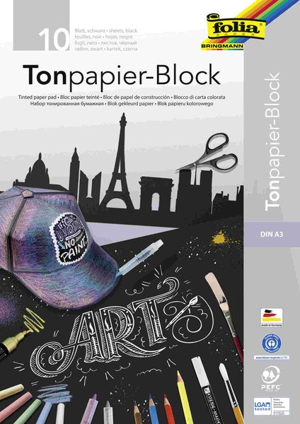 Zeichen- & Bastelblock, DIN A3, 130 g/qm, 10 Blatt schwarzes Papier, Block mit Kopfleimung und 4-farbigem Deckblatt, blauer Engel, LGA tested, Made in Germany