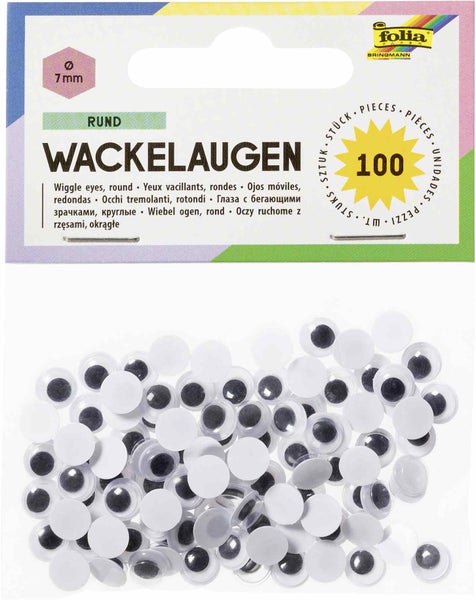 Wackelaugen, rund, 100 Stück, Farbe weiß, rund, Durchmesser 7 mm, verpackt im Polybeutel mit 4-farbig bedrucktem Reiter