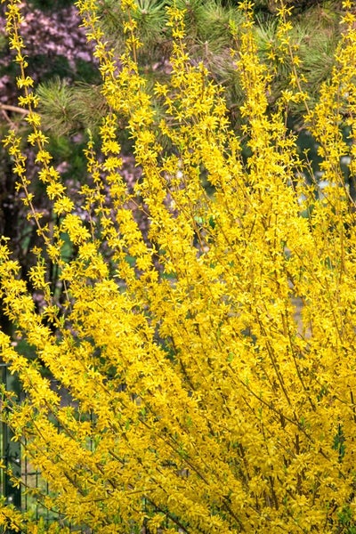 Die Forsythia ‘Mindor’® (Forsythia x intermedia), auch als Goldglöckchen bekannt, ist ein kompakt wachsender Blütenstrauch, der den Garten im zeitigen Frühjahr in ein leuchtendes Gelb taucht. Noch bevor sich das Laub entfaltet, öffnen sich von März bis April unzählige, sattgelbe Blüten entlang der dicht besetzten Triebe und setzen eindrucksvolle Akzente im Beet, Vorgarten oder auf der Terrasse. Das sommergrüne Laub zeigt sich anschließend frischgrün, die Wuchsform bleibt gleichmäßig, buschig und gut verzweigt, wodurch die Forsythie als Zierstrauch sowohl in der Gruppenpflanzung als auch als Solitär überzeugt. Auch als niedrige, frei wachsende Heckenpflanze oder als Kübelpflanze auf Balkon und Patio macht sie eine hervorragende Figur und bringt klassisches Frühlingsflair in kleine und große Gärten gleichermaßen.