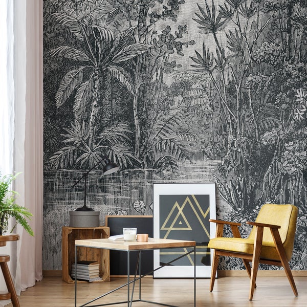 Mit dieser trendigen Fototapete Jungle in Schwarz-Weiß-Tönen von Art for the Home verleihen Sie Ihrem Interieur einen wahrhaft tropischen Look, ohne mit bunten Farben zu überladen zu sein. Ein absoluter Hingucker in Ihrem Wohn- oder Schlafzimmer!