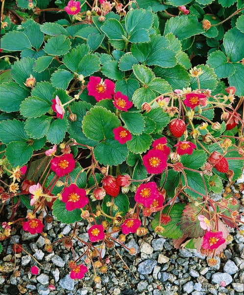 Fragaria x ananassa 'Lipstick' -R-, auch bekannt als Erdbeere, verzaubert mit leuchtend roten Blüten und süßen, aromatischen Früchten von Juni bis September. Diese kompakte Pflanze ist ideal für Kübel, Balkonkästen und Beete. Sie ist pflegeleicht, bienenfreundlich und bevorzugt sonnige Standorte. Die Erdbeere 'Lipstick' erreicht eine Wuchshöhe von bis zu 20 cm und eine Breite von 30 cm. Geliefert wird sie im ca. 9x9 cm Topf.