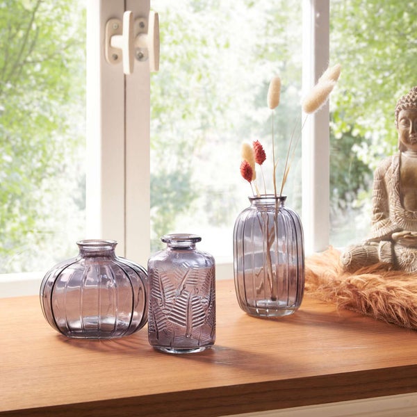 FRANK FLECHTWAREN | Dekovase Grau, 3er Set, GLAS, 10,5 x 10,5 x 8,5 cm, 6 x 6 x 10 cm, 7 x 7 x 11,5 cm