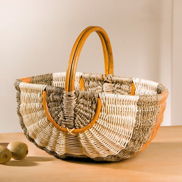Seegras und Rattan in schönen Natur- und Orangetönen, dekorativ auf Rattanrahmen geflochten, stabiler Rattanbügel
