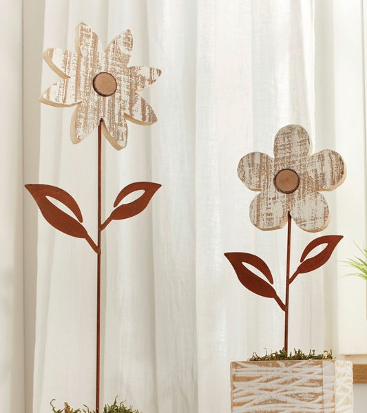 FRANK FLECHTWAREN | Gartenstecker Blume, 2er Set, METALL, HOLZ, 15 x 57 cm, 16 x 69 cm