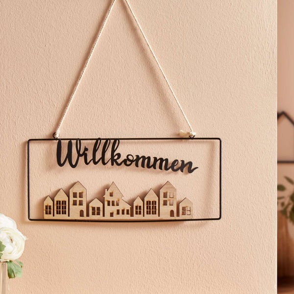 FRANK FLECHTWAREN | Hänger Willkommen, METALL, HOLZ, BAUMWOLLE, 30 x 37 cm