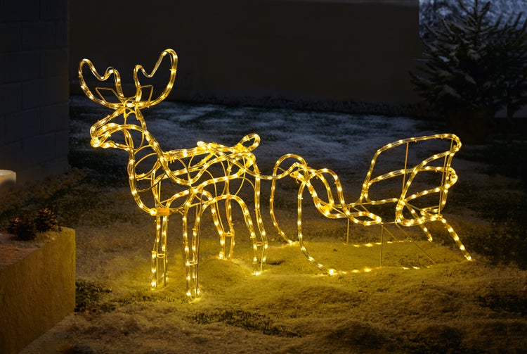 FRANK FLECHTWAREN | LED-Deko Rentier mit Schlitten, METALL, KUNSTSTOFF, Schlitten ca. 58 x 27 x 42 cm, Rentier 64 x 36 x 70 cm, Gesamtlänge 177 cm, Zuleitung 5 Meter