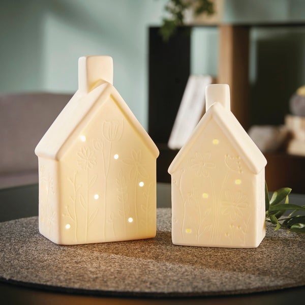 FRANK FLECHTWAREN | LED-Haus Blumenwiese, 2er Set, PORZELLAN, KUNSTSTOFF, 7,8 x 6,3 x 13 cm, 9,5 x 4 x 15,5 cm