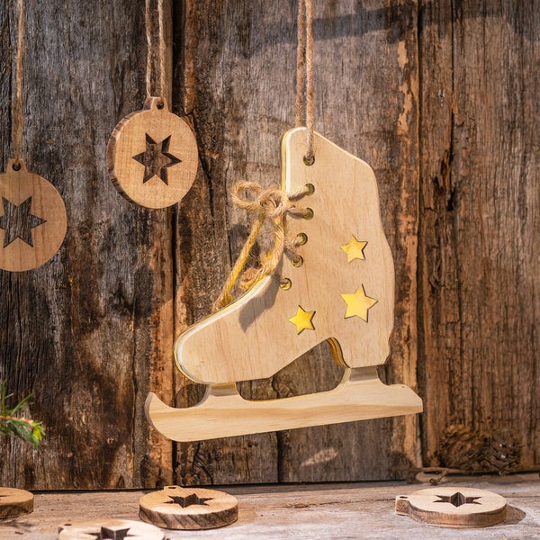 FRANK FLECHTWAREN | LED-Schlittschuh Sternchen, 16,5 x 15 x 2,5 cm, BUCHE, ACRYL, JUTE,