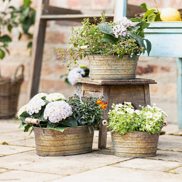 FRANK FLECHTWAREN | Metallwanne mit Holzgriffen, 3er Set, METALL, 17 x 12 x 8 cm, 20 x 14 x 9 cm, 24 x 15 x 10 cm, bei Direktbepflanzung mit Folie ausschlagen