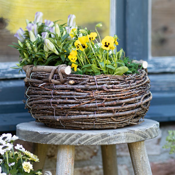 FRANK FLECHTWAREN | Pflanzkorb Birkenreisig, LÄRCHE, HASELNUSS, FOLIE, METALL, ca. Ø 30 x 12 cm