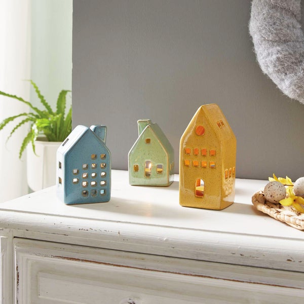 FRANK FLECHTWAREN | Teelichthalter Häuser, 3er Set, PORZELLAN, 6,5 x 6,5 x 10 cm, 6 x 5,5 x 10 cm, 6 x 6 x 13,5 cm