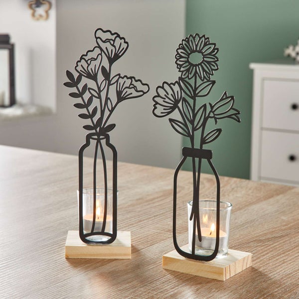 FRANK FLECHTWAREN | Teelichthalter Metallblumen, 2er Set, METALL, HOLZ, GLAS, 7 x 10,5 x 27,5 cm