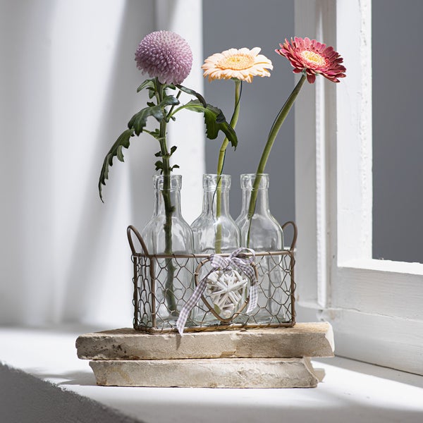 FRANK FLECHTWAREN | Vasenkörbchen Romance, 4tlg., METALL, GLAS, Korb 16 x 6 x 8 cm, Flasche 5 x 5 x 16 cm