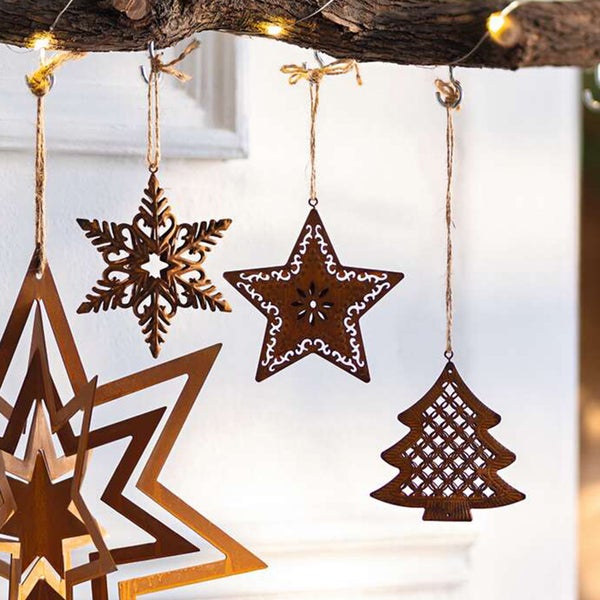 FRANK FLECHTWAREN | Weihnachtshänger Rost, 3er Set, 10,5 x 0,5 x 9 cm, METALL, JUTE