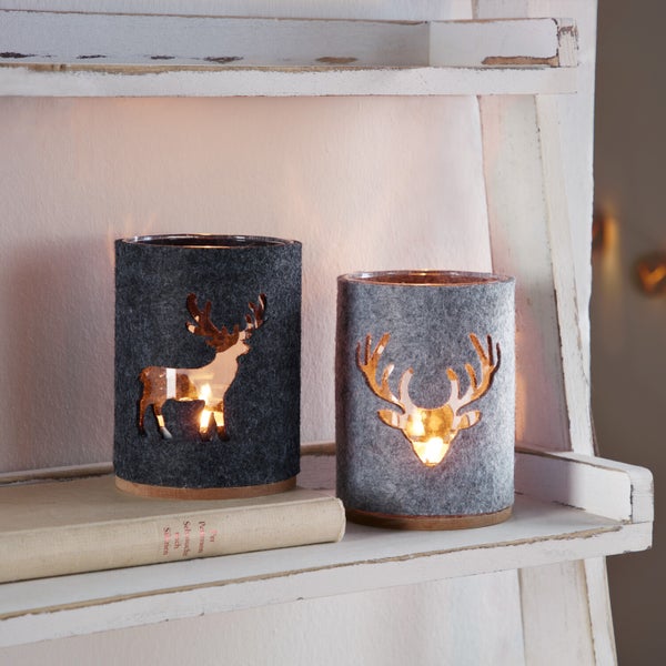 FRANK FLECHTWAREN | Windlicht Hirsch, 2er Set, GLAS, FILZ AUS PET, Ø 14 x 10 cm, ohne Kerzen