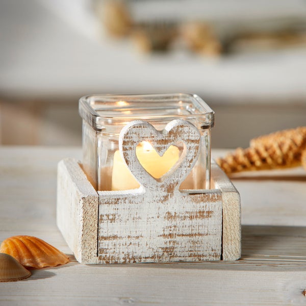 FRANK FLECHTWAREN | Windlicht White Heart, HOLZ, GLAS, 10 x 10 x 8,5 cm