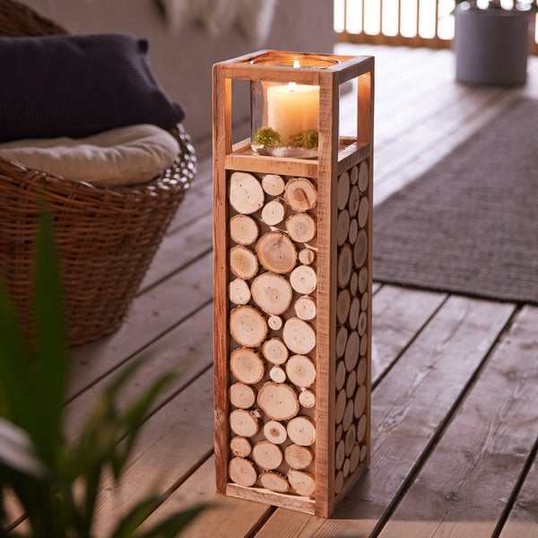 FRANK FLECHTWAREN | Windlichtsäule Holzscheibchen, HOLZ, GLAS, 16 x 16 x 58 cm, Glas Ø 12 x 12 cm