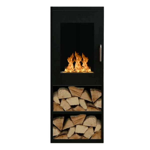 Der freistehende Bioethanol Standkamin Ofen CASORIA bietet ein modernes, kantiges Design in schwarzer Optik. Als Highlight verfügt der Bioethanol Standkamin CASORIA über eine Glastür, welche magnetisch verschlossen wird und zwei seitliche Glasscheiben für einen 270° Flammenblick. Charakteristisch sind außerdem die zwei Dekofächer. Diese sind perfekt um echte Holzscheitel für einen maximal authentischen Look zu platzieren.