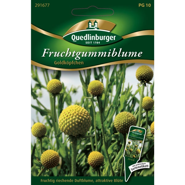 Info: Einjährig. Eine attraktive, aus Chile stammende Duftpflanze, die aufgrund ihres ungewöhnlichen Erscheinungsbildes die Blicke auf sich zieht. Die gelben kugelrunden Blüten und auch die Blätter duften angenehm fruchtig. Der Geruch erinnert stark an Gummibärchen. Die Pflanze hat einen buschigen Aufbau, ihre Blüten erscheinen vielfältig wie kleine Trommelstöcke. Wuchshöhe: ca. 30 - 45 cm. Pflege: Samen flach aussäen, Saattiefe 0,5 cm, leicht andrücken. Aussaaterde verwenden. Stetig feucht halten. Staunässe vermeiden. Jungpflanzen bei einer Wuchshöhe von 8 cm in Töpfe pflanzen oder direkt an Ort und Stelle, wenn keine Fröste zu erwarten sind. Pflanzenabstand: 20 x 30 cm. Verwendung: Die Fruchtgummiblume ist Nektarpflanze für Schmetterlinge, Bienen und Hummeln. Duftpflanzen können für Duftsträuße, Dufthecken, Duftgärten Verwendung finden. Gärtnertipp: Vor dem Auspflanzen der Jungpflanzen ins Freiland, sollten sich diese akklimatisieren.Aussaat:Februar - April im Warmen.Ende Mai-Juni im FreilandKeimung:Ca. 21 - 30 Tagebei 15 - 21 °C.Standort:Sonnig. Lockerer, humoser,durchlässiger Boden.Blüte:Ab Juni bis Oktober.