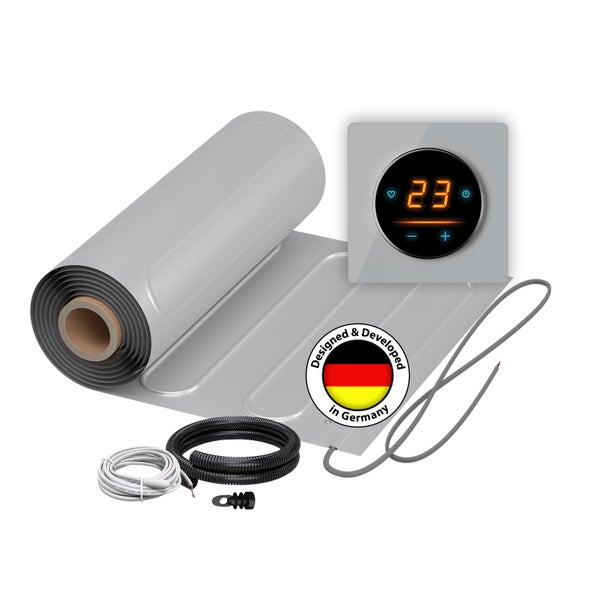 Elektrische Fußbodenheizung als Komplett-Set für Innenräume mit Heizmatte, Thermostat und Zubehör – ideal für schwimmend verlegte Bodenbeläge wie Laminat, Parkett oder Teppich.