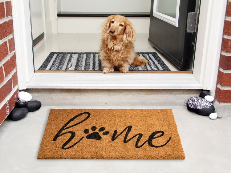 Rechteckige, rutschfeste Indoor-Fußmatte mit Schriftzug und Pfotenabdruck. Dieser beschriftete Fußabtreter mit niedlichem Pfotenabdruck zeigt jedem, der Sie besucht, dass sich bei Ihnen einfach jeder wie zu Hause fühlen kann – egal ob Zwei- oder Vierbeiner. Er besteht aus strapazierfähiger Kokosfaser, die Schmutz und Feuchtigkeit effektiv von den Schuhen entfernt, und verfügt über eine rutschfeste Rückseite. Der liebevoll gestaltete „Home“-Schriftzug, bei dem der Buchstabe „o“ durch eine Tierpfote ersetzt wurde, verleiht der Matte einen verspielten Touch – perfekt für alle, die Herz für Tiere und ein Auge für eine stilvolle Einrichtung haben. Details: Typ Fußmatte. Stil: Klassisch. Farbe: Naturfarben. Material: Stoff. Material: Kokosfasern. Rückseitenmaterial: PVC. Zusammenstellung: 100% Kokosfaser. Form: Rechteckig. Rutschfeste Unterseite: Ja. Muster: Mit Aufschrift. Herstellungsmethode: Getuftet. Abmessungen: Florhöhe: 1.25 cm. Breite: 60 cm. Länge: 90 cm. Gewicht: 3 kg. .Sie kaufen: 1 x Fußmatte. Produktvorteile: Besonders sicher dank rutschfester Unterseite, Dekorativ und zugleich funktional, Zeitloses Design, Hochwertiges Material, Besonders pflegeleicht. Montage: Benötigt keine Montage. Zusatzinformationen: Der Artikel benötigt einige Zeit, bis er seinen ursprünglichen Zustand erreicht hat – daher sollte er so schnell wie möglich ausgerollt werden und innerhalb von 72 Stunden seine vollständige Grösse wieder erreichen. Pflegeanleitung: Kokosfasern: Regelmäßig ausschütteln, um abgelagerten Schmutz zu entfernen. Für eine gründlichere Reinigung kann die Matte mit einem Staubsauger gereinigt werden. Um die Qualität und das Aussehen der Naturfasern zu erhalten, sollte die Matte nicht gewaschen werden.