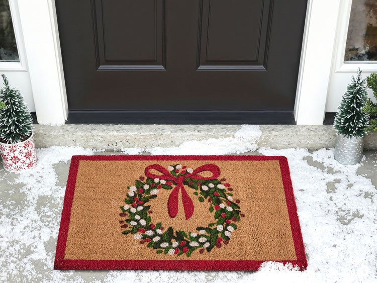 Fußabtreter mit Weihnachtskranzmotiv. Verleihen Sie Ihrem Zuhause in dieser Jahreszeit eine weihnachtliche Note mit unserer charmanten Fußmatte mit fröhlichem Weihnachtsmotiv. Gefertigt aus natürlichen Kokosfasern, entfernt sie Schmutz zuverlässig von den Schuhen und trägt so dazu bei, Ihre Böden sauber zu halten, während sie gleichzeitig für eine warme, festliche Atmosphäre sorgt. Die rutschfeste Gummirückseite garantiert, dass die Matte sicher an ihrem Platz bleibt, während Sie Ihre Gäste willkommen heißen. Details: Typ Fußmatte. Farbe: Naturfarben. Material: Stoff. Material: Kokosfasern. Rückseitenmaterial: PVC. Zusammenstellung: 100% Kokosfaser. Form: Rechteckig. Rutschfeste Unterseite: Ja. Muster: Weihnachtsmotiv. Herstellungsmethode: Getuftet. Abmessungen: Florhöhe: 1.5 cm. Breite: 60 cm. Länge: 90 cm. Gewicht: 3.7 kg. .Sie kaufen: 1 x Fußmatte. Produktvorteile: Perfekt als saisonale Dekoration, Besonders sicher dank rutschfester Unterseite, Gemütliche Ausstrahlung, Umweltfreundliche und recycelbare Materialien, Herstellung aus natürlich widerstandsfähigen Materialien. Montage: Benötigt keine Montage. Zusatzinformationen: Der Artikel benötigt einige Zeit, bis er seinen ursprünglichen Zustand erreicht hat – daher sollte er so schnell wie möglich ausgerollt werden und innerhalb von 72 Stunden seine vollständige Grösse wieder erreichen. Pflegeanleitung: Kokosfasern: Regelmäßig ausschütteln, um abgelagerten Schmutz zu entfernen. Für eine gründlichere Reinigung kann die Matte mit einem Staubsauger gereinigt werden. Um die Qualität und das Aussehen der Naturfasern zu erhalten, sollte die Matte nicht gewaschen werden.