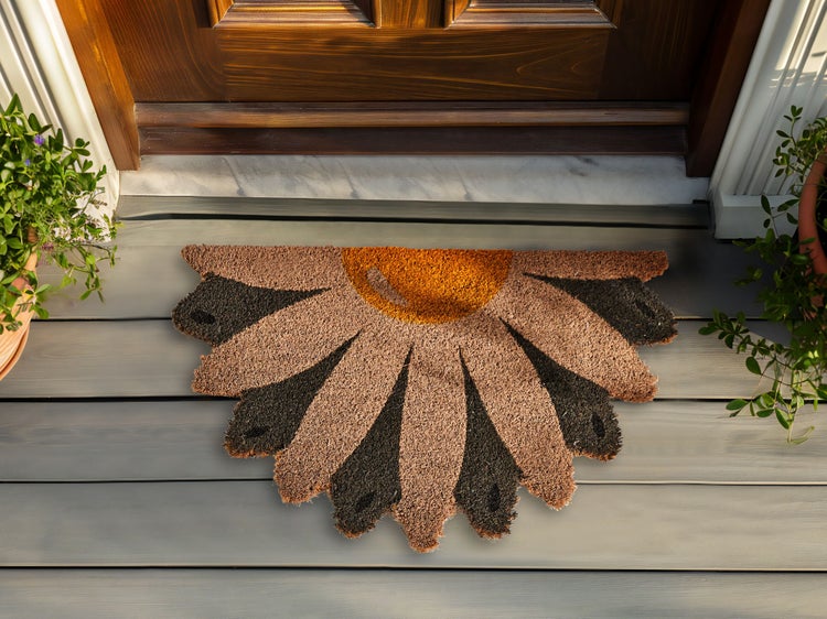 Fußmatte für den Innenbereich mit rutschfester Unterseite. Entdecken Sie die perfekte Mischung aus Funktionalität und Stil mit dieser Fußmatte für den Innenbereich aus natürlichen Kokosfasern. Diese Matte ist eine umweltfreundliche Wahl, die nicht nur Schmutz und Feuchtigkeit mühelos aufnimmt, sondern mit ihrer robusten, rutschfesten Unterseite auch für Sicherheit sorgt. Die einzigartige Form, die an eine Blüte erinnert, und die Farbkombination machen sie zu einem echten Hingucker und verleihen dem Flur eine warme Atmosphäre. Diese Fußmatte, die den Boden sauber hält und dem Raum auf einfache Weise Eleganz verleiht, ist ein Muss für jeden Einrichtungsstil, von modern bis boho. Details: Typ Fußmatte. Stil: Modern. Farbe: Bunt. Material: Stoff. Material: Kokosfasern. Rückseitenmaterial: PVC. Zusammenstellung: 100% Kokosfaser. Form: Halbrund. Rutschfeste Unterseite: Ja. Muster: Blumenmuster. Herstellungsmethode: Getuftet. Abmessungen: Florhöhe: 1.5 cm. Breite: 40 cm. Länge: 60 cm. Gewicht: 1.4 kg. .Sie kaufen: 1 x Fußmatte. Produktvorteile: Zeitloses Design, Dekorativ und zugleich funktional, Umweltfreundliche und recycelbare Materialien, Sicher durch rutschfeste Rückseite, Besonders pflegeleicht. Montage: Benötigt keine Montage. Pflegeanleitung: Regelmäßig ausschütteln, um abgelagerten Schmutz zu entfernen. Für eine gründlichere Reinigung kann die Matte mit einem Staubsauger gereinigt werden. Um die Qualität und das Aussehen der Naturfasern zu erhalten, sollte die Matte nicht gewaschen werden.