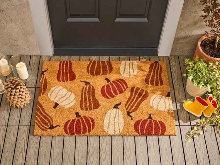Rechteckige Indoor-Fußmatte mit Kürbismotiv und Anti-Rutsch-Rückseite. Dank dieser Türmatte begrüßen Sie Ihre Gäste in einer herbstlichen Atmosphäre und verleihen dabei Ihrem Eingangsbereich eine verspielte Note. Die rutschfeste Unterseite hält den Fußabtreter an Ort und Stelle, während die hochwertigen Kokosnussfasern dafür sorgen, dass Schmutz und Feuchtigkeit beim Eintreten effektiv von Schuhen entfernt werden und Ihr Zuhause sauber bleibt. Das charmante Kürbismotiv bringt Wärme in Ihren Innenbereich und bildet nicht nur einen Blickfang für den Herbst, sondern auch für Halloween. Details: Typ Fußmatte. Stil: Landhausstil. Farbe: Bunt. Material: Stoff. Material: Kokosfasern. Rückseitenmaterial: PVC. Zusammenstellung: 100% Kokosfaser. Form: Rechteckig. Rutschfeste Unterseite: Ja. Muster: Pflanzenmuster. Herstellungsmethode: Getuftet. Abmessungen: Florhöhe: 1.25 cm. Breite: 60 cm. Länge: 90 cm. Gewicht: 3 kg. .Sie kaufen: 1 x Fußmatte. Produktvorteile: Besonders sicher dank rutschfester Unterseite, Dekorativ und zugleich funktional, Traditionelles Design mit moderner Note, Hochwertiges Material, Besonders pflegeleicht. Montage: Benötigt keine Montage. Zusatzinformationen: Der Artikel benötigt einige Zeit, bis er seinen ursprünglichen Zustand erreicht hat – daher sollte er so schnell wie möglich ausgerollt werden und innerhalb von 72 Stunden seine vollständige Grösse wieder erreichen. Pflegeanleitung: Kokosfasern: Regelmäßig ausschütteln, um abgelagerten Schmutz zu entfernen. Für eine gründlichere Reinigung kann die Matte mit einem Staubsauger gereinigt werden. Um die Qualität und das Aussehen der Naturfasern zu erhalten, sollte die Matte nicht gewaschen werden.
