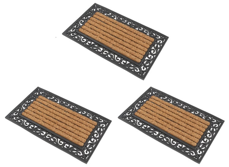 Dieses Premium-Fußmatten Set aus drei rechteckigen Matten überzeugt durch ansprechendes Design, erstklassige Verarbeitung und hervorragende Produkteigenschaften. Die Schmutzfangmatten bestehen aus hochwertigem Gummi und extradicken Kokosfasern. Dabei sind die Ornamente in ansprechender Gusseisen-Optik gehalten, bieten aber dank schwerem Gummimaterial notwendige Rutschfestigkeit in allen Eingangsbereichen. Die Kokos-Matten sind zudem lichtbeständig, wetterfest und pflegeleicht. Die robusten Naturfasern nehmen Schmutz sehr gut auf und glänzen mit antibakteriellen Eigenschaften, sodass sie zu einem sauberen Zuhause beitragen. Mit diesem Türmatten-Set heißen Sie Familie und Freunde stets herzlich willkommen!