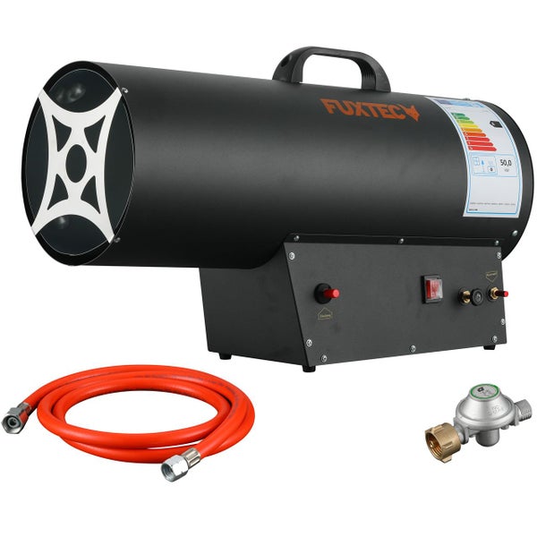 FUXTEC Gasheizgebläse GH51 – regulierbarer Gasheizstrahler 50kW mit Thermostat – Bauheizer/Gasheizer 650 m³/h Luftdurchsatz Heizgebläse inkl. Druckminderer & Überhitzungsschutz