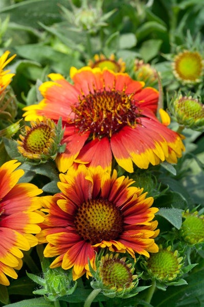 Gaillardia x grandiflora ‘Arizona Sun’, die leuchtkräftige Kokardenblume, ist eine kompakte Blütenstaude, die mit ihren zweifarbigen, rot?orangen Blüten mit goldgelbem Rand vom Frühsommer bis in den Herbst ein Feuerwerk im Beet entfacht. Die reich verzweigte, buschige Zierstaude erreicht etwa 20–30 cm Höhe und bildet dichte Polster mit graugrünem, lanzettlichem Laub, das die warmen Farben der Blüten perfekt inszeniert. Als langlebiger Sommerblüher eignet sich diese Gartenstaude hervorragend für sonnige Beete, Rabatten und den Vorgarten, bringt im Präriebeet und Steingarten trockene, warme Plätze zum Strahlen und überzeugt ebenso als niedrige Solitärpflanze oder in Gruppenpflanzung für geschlossene, farbintensive Flächen. Auch im Kübel auf Terrasse und Balkon zeigt sich die Kokardenblume als attraktive Kübelpflanze mit hoher Fernwirkung und sauberer Wuchsform.