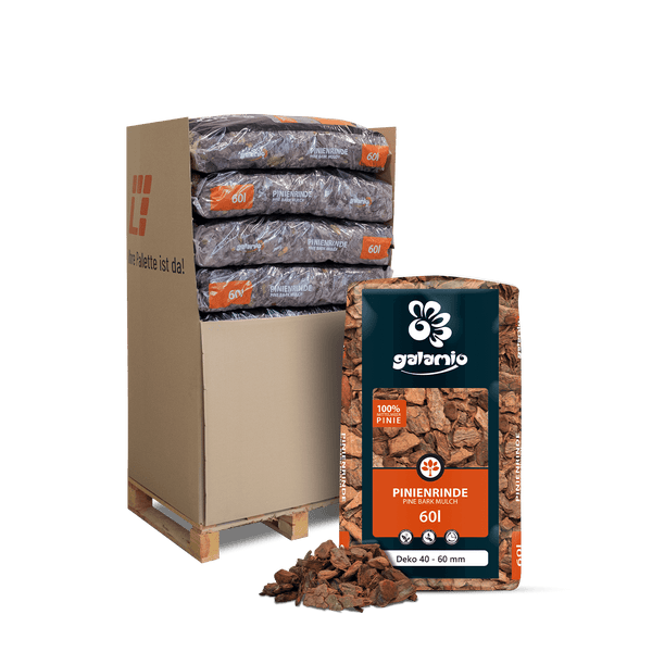 Rindenmulch Pinie Deko ist ein reines Naturprodukt aus der Rinde und den Holzfasern der Mittelmeerkiefer. Mit einer dekorativen rostroten Färbung und einer groben Körnung von 40-60 mm vereint er Ästhetik und Funktionalität. Der Mulch schützt den Boden zuverlässig vor äußeren Einflüssen wie Nässe, Hitze oder Frost und verbessert die Bodenqualität durch langsame Verrottung, die über einen langen Zeitraum wichtige Nährstoffe freisetzt. Im Vergleich zu heimischem Rindenmulch entzieht er dem Boden weniger Stickstoff und trägt somit aktiv zur Erhaltung der Bodenstruktur bei. Durch die südliche Herkunft enthält der Mulch kaum Cadmium und sorgt dafür, dass der Boden nicht mit Schwermetallen belastet wird. Gleichzeitig hemmt er das Wachstum von Unkraut, reguliert Feuchtigkeit und Temperatur und schützt den Boden vor Erosion. Das Erdreich bleibt länger kühl und feucht, was optimale Bedingungen für Pflanzen schafft. Wie in der Natur, wo Böden von einer schützenden Schicht bedeckt sind, bietet Rindenmulch Pinie Lebensraum für Mikroorganismen, Insekten und Pilze, die das natürliche Gleichgewicht des Bodens fördern. Neben seiner Funktionalität überzeugt der Mulch auch optisch: Seine warme, rostrote Färbung und die grobe Körnung machen ihn zu einem dekorativen Highlight für Grünflächen, Pflanzkübel, Teichbegrenzungen oder sogar Barfußpfade. Die elastische Beschaffenheit der Rinde sorgt dabei für ein angenehmes Laufgefühl. Beim Anlegen von Wegen ist ein stabiler Unterbau mit leichtem Gefälle ideal, um Regenwasser effektiv abzuleiten. Bestellen Sie die GALAMIO® Rindenmulch Pinie ganz bequem und erhalten Sie die Ware direkt nach Hause geliefert. Die Lieferung erfolgt in praktischen 60-Liter-Säcken, die ordentlich auf einer Palette gestapelt sind und per Spedition zuverlässig ankommen. Je nach Bedarf können Sie zwischen 13, 26 oder 39 Säcken pro Palette wählen.