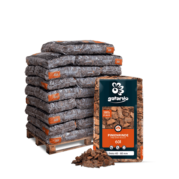Rindenmulch Pinie Deko ist ein reines Naturprodukt aus der Rinde und den Holzfasern der Mittelmeerkiefer. Mit einer dekorativen rostroten Färbung und einer groben Körnung von 40-60 mm vereint er Ästhetik und Funktionalität. Der Mulch schützt den Boden zuverlässig vor äußeren Einflüssen wie Nässe, Hitze oder Frost und verbessert die Bodenqualität durch langsame Verrottung, die über einen langen Zeitraum wichtige Nährstoffe freisetzt. Im Vergleich zu heimischem Rindenmulch entzieht er dem Boden weniger Stickstoff und trägt somit aktiv zur Erhaltung der Bodenstruktur bei. Durch die südliche Herkunft enthält der Mulch kaum Cadmium und sorgt dafür, dass der Boden nicht mit Schwermetallen belastet wird. Gleichzeitig hemmt er das Wachstum von Unkraut, reguliert Feuchtigkeit und Temperatur und schützt den Boden vor Erosion. Das Erdreich bleibt länger kühl und feucht, was optimale Bedingungen für Pflanzen schafft. Wie in der Natur, wo Böden von einer schützenden Schicht bedeckt sind, bietet Rindenmulch Pinie Lebensraum für Mikroorganismen, Insekten und Pilze, die das natürliche Gleichgewicht des Bodens fördern. Neben seiner Funktionalität überzeugt der Mulch auch optisch: Seine warme, rostrote Färbung und die grobe Körnung machen ihn zu einem dekorativen Highlight für Grünflächen, Pflanzkübel, Teichbegrenzungen oder sogar Barfußpfade. Die elastische Beschaffenheit der Rinde sorgt dabei für ein angenehmes Laufgefühl. Beim Anlegen von Wegen ist ein stabiler Unterbau mit leichtem Gefälle ideal, um Regenwasser effektiv abzuleiten. Bestellen Sie die GALAMIO® Rindenmulch Pinie ganz bequem und erhalten Sie die Ware direkt nach Hause geliefert. Die Lieferung erfolgt in praktischen 60-Liter-Säcken, die ordentlich auf einer Palette gestapelt sind und per Spedition zuverlässig ankommen. Je nach Bedarf können Sie zwischen 13, 26 oder 39 Säcken pro Palette wählen.