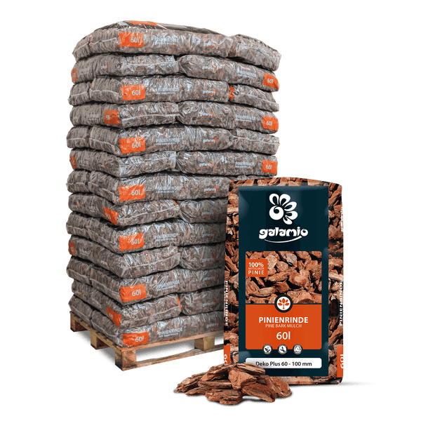 Rindenmulch Pinie Deko Plus ist ein hochwertiges Naturprodukt, das aus der Rinde und den Holzfasern der Mittelmeerkiefer besteht. Mit seiner dekorativen rostroten Färbung und einer groben Körnung von 60-100 mm ist er nicht nur optisch ansprechend, sondern auch äußerst funktional. Der Mulch schützt den Boden vor Witterungseinflüssen wie Nässe, Hitze oder Frost und verbessert durch langsame Verrottung die Bodenqualität. Dabei gibt er über einen Zeitraum von bis zu 24 Monaten wichtige Nährstoffe ab und fördert die Humusbildung. Im Vergleich zu heimischem Rindenmulch entzieht dieser Mulch dem Boden weniger Stickstoff und trägt dadurch nachhaltig zur Schonung der Bodenstruktur bei. Dank der südlichen Herkunft enthält er kaum Cadmium, wodurch eine Schwermetallbelastung des Bodens verhindert wird. Zusätzlich reguliert der Mulch die Feuchtigkeit und Temperatur des Bodens, schützt vor Erosionen und hemmt das Wachstum von Unkraut. Das Material stabilisiert die Bodenstruktur und hält die Erde über lange Zeiträume kühl und feucht, wodurch optimale Bedingungen für das Pflanzenwachstum geschaffen werden. Außerdem bietet der Rindenmulch Pinie einen Lebensraum für zahlreiche Mikroorganismen, Pilze und Insekten, die das ökologische Gleichgewicht im Boden unterstützen. Die grobe Körnung und natürliche Färbung machen den Mulch besonders dekorativ auf großen Flächen, in Teichnähe oder zwischen Sträuchern. Er ist außerdem als Beetabgrenzung und in Kombination mit anderen Naturmaterialien einsetzbar. Während der Verrottung eignet sich der Mulch hervorragend als natürlicher Dünger für saure oder alkalische Böden. Bestellen Sie die GALAMIO® Rindenmulch Pinie ganz bequem und erhalten Sie die Ware direkt nach Hause geliefert. Die Lieferung erfolgt in praktischen 60-Liter-Säcken, die ordentlich auf einer Palette gestapelt sind und per Spedition zuverlässig ankommen. Je nach Bedarf können Sie zwischen 13, 26 oder 39 Säcken pro Palette wählen.