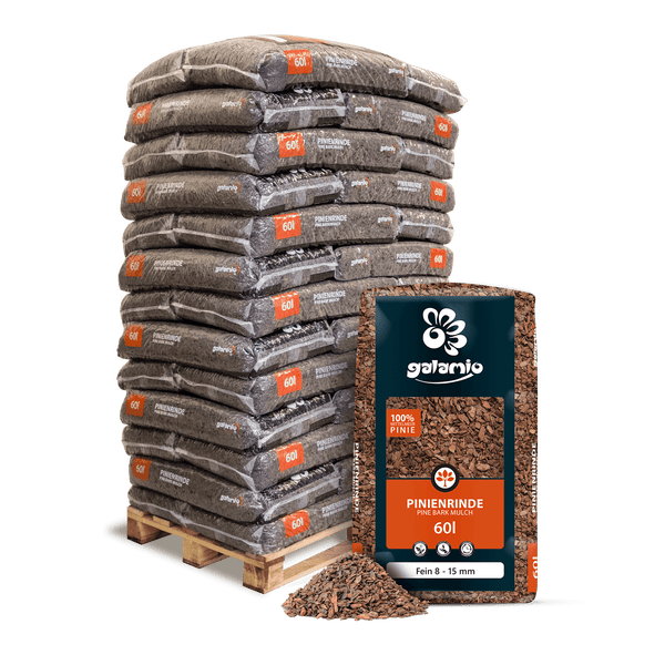 Rindenmulch Pinie Fein ist ein hochwertiges Naturprodukt, das aus der Rinde und den Holzfasern der Mittelmeerkiefer gewonnen wird. Mit seiner dekorativen rostroten Färbung und der Körnung von 8–15 mm ist er nicht nur ein optischer Hingucker, sondern auch äußerst funktional. Der Mulch schützt den Boden vor Witterungseinflüssen wie Nässe, Hitze oder Frost und verbessert die Bodenqualität durch langsame Verrottung, die wichtige Nährstoffe freisetzt. Im Vergleich zu heimischem Rindenmulch schont er den Boden, da er weniger Stickstoff entzieht. Dank der südlichen Herkunft enthält Rindenmulch Pinie kaum Cadmium, wodurch der Boden nicht mit Schwermetallen belastet wird. Der Mulch reguliert Feuchtigkeit und Temperatur im Boden, hemmt das Wachstum von Unkraut und schützt den Boden vor Erosion. Er stabilisiert die Bodenstruktur und schafft eine kühle, feuchte Umgebung, die das Pflanzenwachstum begünstigt. Gleichzeitig bietet er Lebensraum für Insekten und Mikroorganismen, die das natürliche Gleichgewicht im Boden unterstützen. Die feine Körnung eignet sich hervorragend für kleine Pflanzflächen, Beete und dekorative Bereiche im Garten. Besonders unter Gehölzen oder Hecken schafft er ideale Bedingungen für Schatten- und Halbschattengewächse. Auch in Pflanzkästen oder Schalen entfaltet der Mulch seine natürliche Schönheit und verströmt einen angenehmen Waldduft. Durch die langsame Zersetzung bleibt die Mulchschicht über einen langen Zeitraum wirksam, wodurch der Aufwand für Nachschichtungen gering ist. Das macht Rindenmulch Pinie zu einer besonders pflegeleichten und langlebigen Lösung für die Bodenabdeckung. Bestellen Sie die GALAMIO® Rindenmulch Pinie ganz bequem und erhalten Sie die Ware direkt nach Hause geliefert. Die Lieferung erfolgt in praktischen 60-Liter-Säcken, die ordentlich auf einer Palette gestapelt sind und per Spedition zuverlässig ankommen. Je nach Bedarf können Sie zwischen 13, 26 oder 39 Säcken pro Palette wählen.
