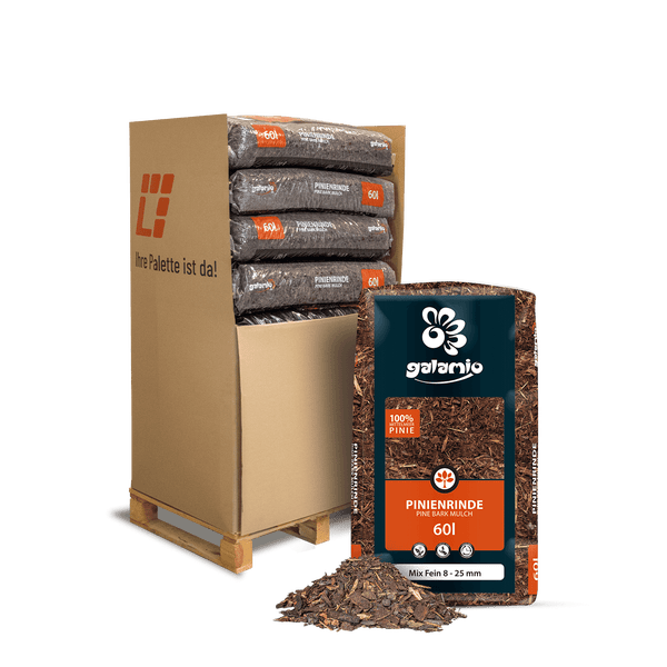 Rindenmulch Pinie Mix Fein ist ein hochwertiges Naturprodukt, das aus der Rinde und den Holzfasern der Mittelmeerkiefer gewonnen wird. Mit seiner dekorativen rostroten Färbung und der Körnung von 8–25 mm ist er nicht nur ein optischer Hingucker, sondern auch äußerst funktional. Der Mulch schützt den Boden vor Witterungseinflüssen wie Nässe, Hitze oder Frost und verbessert die Bodenqualität durch langsame Verrottung, die wichtige Nährstoffe freisetzt. Im Vergleich zu heimischem Rindenmulch schont er den Boden, da er weniger Stickstoff entzieht. Dank der südlichen Herkunft enthält Rindenmulch Pinie kaum Cadmium, wodurch der Boden nicht mit Schwermetallen belastet wird. Der Mulch reguliert Feuchtigkeit und Temperatur im Boden, hemmt das Wachstum von Unkraut und schützt den Boden vor Erosion. Er stabilisiert die Bodenstruktur und schafft eine kühle, feuchte Umgebung, die das Pflanzenwachstum begünstigt. Gleichzeitig bietet er Lebensraum für Insekten und Mikroorganismen, die das natürliche Gleichgewicht im Boden unterstützen. Die feine Körnung eignet sich hervorragend für kleine Pflanzflächen, Beete und dekorative Bereiche im Garten. Besonders unter Gehölzen oder Hecken schafft er ideale Bedingungen für Pflanzen wie Koniferen. Auch in Pflanzkästen oder Schalen entfaltet der Mulch seine natürliche Schönheit und verströmt einen angenehmen Waldduft. Durch die langsame Zersetzung bleibt die Mulchschicht über einen langen Zeitraum wirksam, wodurch der Aufwand für Nachschichtungen gering ist. Das macht Rindenmulch Pinie zu einer besonders pflegeleichten und langlebigen Lösung für die Bodenabdeckung. Bestellen Sie die GALAMIO® Rindenmulch Pinie ganz bequem und erhalten Sie die Ware direkt nach Hause geliefert. Die Lieferung erfolgt in praktischen 60-Liter-Säcken, die ordentlich auf einer Palette gestapelt sind und per Spedition zuverlässig ankommen. Je nach Bedarf können Sie zwischen 13, 26 oder 39 Säcken pro Palette wählen.