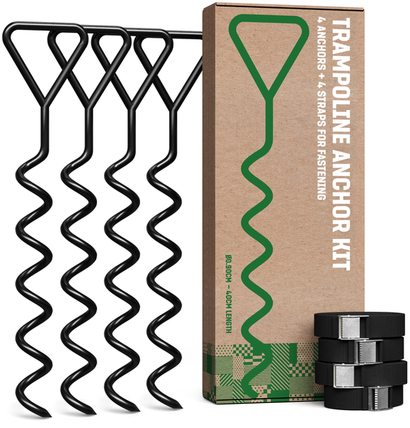 KOMPLETTES SET FÜR MAXIMALE STABILITÄT – Das Trampolin Anker Set besteht aus 4 robusten Bodenankern und 4 strapazierfähigen Befestigungsgurten, die zusammen für optimalen Halt Ihres Trampolins sorgen.