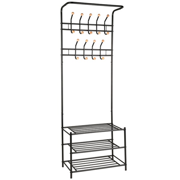 Du hast eine Nische in Deinem Eingangsbereich, die Du sinnvoll nutzen willst? Dann entscheide Dich für die Garderobe mit 3 Schuhablagen von tectake. Ob Jacken, Mäntel, Schals, Mützen oder Gürtel – an den 18 Haken des Allzweckständers findet alles seinen Platz. Schuhe, Taschen, Körbe und Rucksäcke lassen sich bequem auf den unteren drei Ablageflächen verstauen. Durch ihre Vielseitigkeit bei optimaler Raumausnutzung eignet sie sich zum Beispiel vorzüglich zur Aufbewahrung von Fitnesskleidung, vom Stirnband bis zum Turnschuh. Mit ihrem schicken, modernen Design macht die Garderobe mit 3 Schuhablagen von tectake in jeder Wohnung eine gute Figur.