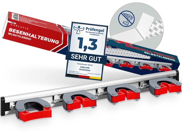 FESTER HALT: Die Geräteleiste hält ein Gewicht von bis zu 5 Kilo aus. Werkzeug, Schrubber, Besen und Co. können also ohne Bedenken angebracht werden. Solltest du die Halterung an einem anderen Platz anbringen wollen, findest du noch einen Ersatzstreifen im Set.