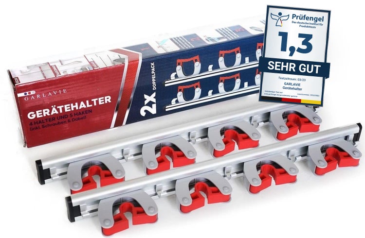 Garlavie Gerätehalter mit 4 Haltern und 5 Haken (45cm) I flexible Besenhalterung Wand für mehr Ordnung I Premium Besenhalter und Gartenwerkzeug Halterung