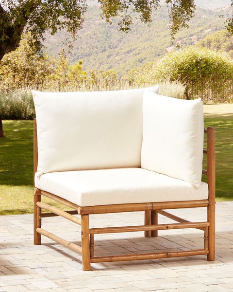 Gemütlicher Bambus-Gartensessel mit cremeweißen Kissen. Schaffen Sie Ihre perfekte Gartenoase mit diesem Ecksessel für modulare Gartensets. Seine gesamte Konstruktion besteht aus hellem Bambusholz, das für die Langlebigkeit und Robustheit des Sessels sorgt. Der Modul-Sessel ist mit einem passenden Sitzkissen ergänzt, das über einen abnehmbaren, pflegeleichten Bezug verfügt. Die zusätzlichen Rückenkissen heben den Sitzkomfort und lassen Sie in wohliger Entspannung versinken. Zudem kann das Bambus-Eckteil nicht nur als frei stehender Sessel gebraucht, sondern auch mit anderen Modulen verbunden werden; so können Sie sich nur in wenigen Schritten Ihre eigene Sofalandschaft zusammenstellen. Dank seines gemütlichen Boho-Looks und seiner beständigen Materialien findet sich dieser Sessel sowohl im Innen- als auch im Außenbereich zurecht. Details: Typ Sessel. Farbe: Weiß. Farbton: Cremeweiß. Material: Holz. Material: Bambus. Zusätzliches Material: Stoff. Gestellmaterial: Holz. Sitzmaterial: Stoff. Zusammenstellung: 100% Polyester. Armlehnen: Nein. Finish: Naturell. Zusammenklappbar: Nein. Stapelbar: Nein. Abmessungen: Tiefe: 67 cm. Dicke der Polsterauflagen: 8 cm. Sitzhöhe: 39 cm. Breite: 67 cm. Höhe: 80 cm. Sitzfläche: 53x53 cm. Gewicht: 10 kg. Max. Belastung: 100 kg. .Sie kaufen: 1 x Eckmodul, 2 x Rückenkissen, 1 x Sitzkissen. Produktvorteile: Ausgezeichneter Platz zum Entspannen, Niedrige und tiefe Sitzfläche, Bringt Wärme in den Aussenbereich, Pflegeleichtes und strapazierfähiges Material, Damit die Qualität des Artikels erhalten bleibt, sollte er vor Wasser und Regen geschützt werden, Abnehmbare Bezüge. Montage: Nicht montiert.5 - 15 Min. Zusatzinformationen: Da bei der Herstellung natürliche Materialien verwendet werden, können kleine Farb-, Form-, bzw. Größendifferenzen auftreten. Diese Unterschiede stellen jedoch keinen Produktfehler dar. Beständigkeit: Rostbeständig, UV-beständig. Beständigkeit Text: UV-strahlenbeständige Möbel weisen eine erhöhte Beständigkeit gegen Verblassen oder Verfärbung auf. Wir empfehlen jedoch, dass Sie das Produkt bei Nichtgebrauch abgedeckt aufbewahren. Dies gewährleistet die maximale Lebensdauer der Möbel. Dank eines entsprechenden Finish zeichnet sich das Produkt Oberfläche durch eine Rostbeständigkeit aus. Dies bedeutet, dass es im Freien genutzt werden kann. Werden die Möbel nicht genutzt, sollte entweder eine Abdeckung verwendet oder sie sollten an einem trockenen Ort gelagert werden. Pflegeanleitung: Bambus: 1.Bitte ausschließlich milde Reinigungsmittel und weiche Tücher verwenden. Dabei immer in Richtung der Maserung abwischen. Feuchte Stellen sofort mit einem weichen Tuch trocken reiben und Dauernässe bei der Reinigung vermeiden. 2.Geöltes Holz sollte vor der Benutzung und nach der Saison vor der Einlagerung nachgeölt werden, besonders bei feuchtem Klima. 3.Wir empfehlen bei ungünstigen Witterungsbedingungen und für die Wintersaison eine Schutzabdeckung zu verwenden oder, wenn möglich, die Gartenmöbel trocken und kühl drinnen zu lagern. Stoff: 1.Nur von Hand, mit kaltem Wasser und milden Reinigungsmitteln auf der rechten Seite mit geschlossenem Reißverschluss waschen. 2.Bitte nicht im Trockner trocknen und auch nicht bügeln, 3.Wenn die Textilien nicht verwendet werden, sollten sie an einem sauberen und trockenen Ort vor ungünstigen Witterungseinflüssen geschützt werden.