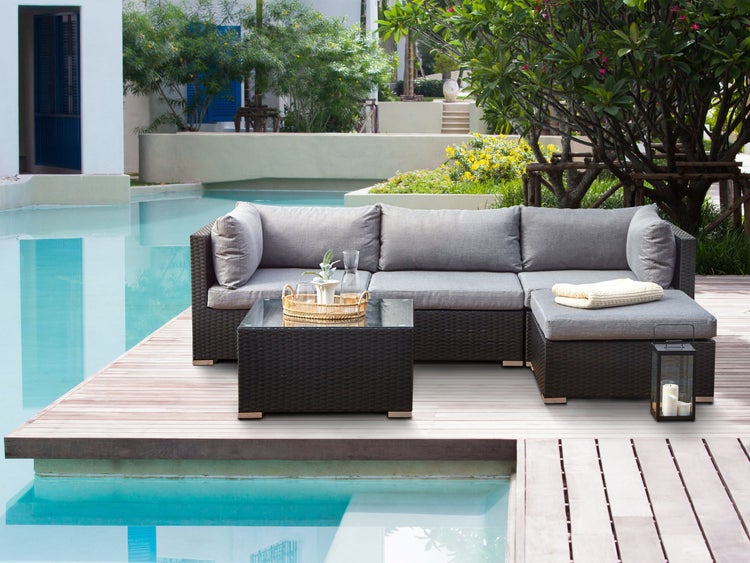 Modulares Gartenlounge Set aus langlebigem PE-Rattan. Dank dieser Lounge können Sie gemütliche Stunden unter freiem Himmel verbringen und die Beine auf dem Longchair angenehm hochlagern oder sich auch hinlegen. Individuelle Kombinationsmöglichkeiten der einzelnen Bestandteile erlauben eine perfekte Anpassung an Ihre Wunschvorstellungen. Bequeme Sitzkissen überzeugen nicht nur durch höchsten Komfort, sondern verleihen den Gartenmöbeln auch eine einmalige Optik. Ein passender Teetisch mit einer rechteckigen Tischplatte aus pflegeleichtem Sicherheitsglas rundet das Set harmonisch ab. Das pflegeleichte, strapazierfähige und unempfindliche Polyrattangeflecht ist insbesondere für den langfristigen Aufenthalt im Freien bestens konzipiert. Details: Typ Sitzgruppe. Farbe: Schwarz. Material: PE Rattan. Material: PE Rattan. Zusätzliches Material: Sicherheitsglas. Tischplattenmaterial: Glas. Zusammenstellung: 100% Polyester. Form: L-förmig. Finish: Pulverbeschichtet. Ausrichtung: linksseitig. Schaumstoffdichte: 23 kg/m3. Anzahl Sitzplätze: 4 Personen. Abmessungen: Couchtisch: 72x72x38. Ottomane: 75x75x37 cm. Dicke der Polsterauflagen: 10 cm. Sitzhöhe: 37 cm. Sofa: 245x159x64. Gesamtmasse: 159x245x64. Gewicht: 59 kg. Max. Belastung des Tischs: 70 kg. Max. Belastung p.P: 120 kg. .Sie kaufen: 1 x Ottomane, 1 x Couchtisch, 2 x Eckteile, 1 x Sessel ohne Armlehnen, Kissen sind im Lieferumfang enthalten. Produktvorteile: Niedrige und tiefe Sitzfläche, Dicke Polsterung für grössten Komfort, Zeitloses Design, Korrosionsfreies Gestell, UV-Beständigkeit Klasse 5 (ISO 105-B02), Wasserdicht dank hochwertiger Materialien, Kissenbezüge mit versteckten Nähten und Reissverschlüssen, Robuste Tischplatte aus Sicherheitsglas. Montage: Benötigt keine Montage. Beständigkeit: Feuchtigkeitsbeständig, Rostbeständig, Windbeständig, UV-beständig. Beständigkeit Text: Feuchtigkeitsbeständigkeit bedeutet, dass der Artikel leichtem Regenschauer und hoher Luftfeuchtigkeit im Außenbereich standhält. Sollte es nicht möglich sein, ihn drinnen zu lagern, sollte er mit einem Regenschutz abgedeckt werden. Wenn Möbel oder Accessoires längere Zeit Feuchtigkeit ausgesetzt werden, kann dies zu anhaltenden Schäden führen. Dank eines entsprechenden Finish zeichnet sich das Produkt Oberfläche durch eine Rostbeständigkeit aus. Dies bedeutet, dass es im Freien genutzt werden kann. Werden die Möbel nicht genutzt, sollte entweder eine Abdeckung verwendet oder sie sollten an einem trockenen Ort gelagert werden. Dieses Produkt besitzt eine hohe Windbeständigkeit, weshalb es nicht umkippen oder seine Stabilität aufgrund von Windböen verlieren sollte. Dieser Artikel ist aus solchen Stoffen gefertigt, die im Vergleich zu Standardgeweben über eine stärkere UV-Beständigkeit verfügen und somit eine höhere Farbbeständigkeit aufweisen. Trotzdem sollte man das Produkt bei Nichtgebrauch abgedeckt aufbewahren, um seine Lebensdauer zu verlängern. Pflegeanleitung: PE Rattan: 1.Die Reinigung sollte nur mit handelsüblicher milder Seifenlauge erfolgen. Vermeiden Sie bitte starke chemische Reinigungsmittel. 2.Um die Lebensdauer Ihrer Möbel zu verlängern, setzten Sie das Produkt keiner direkten Sonneneinstrahlung aus. 3.Beachten Sie, dass durch die Lichtreflexion auf Glaselemente, die Kunststoffteile Ihres Produkts beschädigt werden können. 4.Wir empfehlen für die Wintersaison eine Schutzhülle zu verwenden oder, wenn möglich, die Möbel trocken und kühl drinnen zu verwahren. Stoff: 1.Nur von Hand, mit kaltem Wasser und milden Reinigungsmitteln auf der rechten Seite mit geschlossenem Reißverschluss waschen. 2.Bitte nicht im Trockner trocknen und auch nicht bügeln, 3.Wenn die Textilien nicht verwendet werden, sollten sie an einem sauberen und trockenen Ort vor ungünstigen Witterungseinflüssen geschützt werden. Sicherheitsglas: 1.Bitte ausschließlich milde Reinigungsmittel bzw. Glasreiniger und weiche Tücher verwenden. Feuchte Stellen mit einem weichen Tuch trocken reiben. 2.Keine scheuernden Reinigungsmittel nutzen, da diese die Oberfläche beschädigen können. 3.Die Glasflächen sollten nach Regen/Schnee trocken gewischt werden. Zusätzlich empfehlen wir für die Wintersaison Schutzabdeckungen zu verwenden oder, wenn möglich, die Möbel trocken und kühl drinnen zu lagern. 4.Verfügt Ihr Artikel über einen Crashglas-Effekt, sollte dieser unbedingt an einem feuchtigkeitsgeschützten Ort aufbewahrt werden.