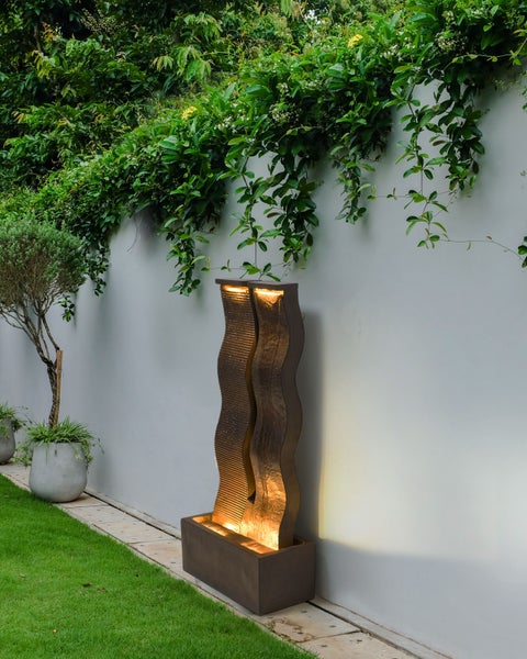 Wasserfall-Brunnen mit LED-Lichtern. Schaffen Sie eine entspannte Atmosphäre in Ihrem Garten oder auf der Terrasse mit diesem modernen Wasserspiel. Die integrierten LED-Leuchten setzen das fließende Wasser stimmungsvoll in Szene und sorgen für ein schönes Ambiente am Abend. Gefertigt aus robustem, UV-beständigem Harz, ist der Brunnen wetterfest und behält seinen eleganten Look. Eine stilvolle und pflegeleichte Ergänzung für jeden Außenbereich. Details: Typ Gartenbrunnen. Farbe: Braun. Lichtfarbe: Neutralweiß. Material: Kunststoff. Material: Harz. Zusätzliches Material: Glasfaser. Fassung: 1,2 W. Schutzklasse: IP 44 (spritzwassergeschützt). Lichtstrom: 85. Spannung 230 V (50 Hz). Abmessungen: Kabellänge: 500 cm. Tiefe: 24 cm. Breite: 50 cm. Höhe: 106 cm. Gewicht: 12 kg. .Sie kaufen: 1 x Gartenbrunnen. Produktvorteile: Modernes Design, Ansprechendes LED-Licht für ein angenehmes Raumklima, UV-Beständigkeit, Internationales CE Prüfzeichen, Geschützt gegen harte Fremdkörper über 1 mm und Spritzwasser mit geringer Geschwindigkeit (IP 44), Besonders pflegeleicht. Montage: Erfordert Installation und Montage. Zusatzinformationen: Das Produkt ist auf einem festen Untergrund zu montieren. Bei Gras- oder Kiesböden muss ein Loch ausgehoben und mit Beton oder einem geeigneten Fundament gefüllt werden, um eine sichere Montage zu gewährleisten. Beständigkeit: UV-beständig, Wasserbeständig, Windbeständig, Rostbeständig. Beständigkeit Text: Der Artikel ist aus UV-beständigen Materialien hergestellt, so dass er im Freien verwendet werden kann, ohne dass die Farbe verblasst. Dieses Produkt zeichnet sich durch eine hohe Wasserbeständigkeit aus. Dies bedeutet, dass es in Kontakt mit Regen oder anderen Flüssigkeiten nicht beschädigt wird. Sie können das Produkt im Freien, auch bei Regen oder einer hohen Luftfeuchtigkeit nutzen. Außerhalb der Saison sollte das Produkt bedeckt und an einer abgedachten Stelle aufbewahrt werden. Dieses Produkt besitzt eine hohe Windbeständigkeit, weshalb es nicht umkippen oder seine Stabilität aufgrund von Windböen verlieren sollte. Dank eines entsprechenden Finish zeichnet sich das Produkt Oberfläche durch eine Rostbeständigkeit aus. Dies bedeutet, dass es im Freien genutzt werden kann. Werden die Möbel nicht genutzt, sollte entweder eine Abdeckung verwendet oder sie sollten an einem trockenen Ort gelagert werden. Pflegeanleitung: Harz: 1.Regelmäßig Wasser nachfüllen, um Wasserverlust durch Verdunstung zu minimieren. 2.Um Mineralablagerungen und Bakterienbildung zu minimieren, das Wasser alle zwei Wochen austauschen. 3.Den Brunnen und die Pumpe regelmäßig überprüfen und reinigen, wenn sie über einen längeren Zeitraum genutzt werden. 4.Wird der Brunnen längere Zeit nicht benutzt, ziehen Sie den Stecker, reinigen Sie den Brunnen und das Zubehör und entfernen Sie das gesamte Wasser, um ihn sauber und trocken zu halten. 5.Wenn der Brunnen nicht funktioniert, überprüfen Sie, ob der Stecker vollständig in die Steckdose eingesteckt ist und ob die Steckdose mit Strom versorgt wird. 6.Den Brunnen mit einem weichen Tuch reinigen und auf Reinigungsmittel verzichten.