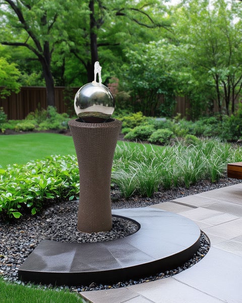 Kugelbrunnen für den Garten mit LED-Licht. Verleihen Sie Ihrem Außenbereich eine besondere Note mit diesem modernen Wasserspiel, das stilvolles Design mit beruhigendem Wasserfluss verbindet. Die elegante Säule mit geflochtener Textur trägt eine glänzende Kugel, aus der das Wasser sanft sprudelt und einen faszinierenden Effekt erzeugt. Gefertigt aus hochwertigen, wetterbeständigen Materialien, vereint diese Wasserfontäne Ästhetik und Langlebigkeit. Eine harmonische Kombination aus moderner Eleganz und entspannender Atmosphäre – ideal als Blickfang für Garten oder Terrasse. Details: Typ Gartenbrunnen. Farbe: Braun. Lichtfarbe: Neutralweiß. Material: Stein. Material: Lehm-Faser-Mischung. Zusätzliches Material: Glasfaser. Fassung: 1,2 W. Schutzklasse: IP 44 (spritzwassergeschützt). Lichtstrom: 85. Spannung 230 V (50 Hz). Abmessungen: Kabellänge: 500 cm. Tiefe: 39 cm. Breite: 39 cm. Höhe: 111 cm. Gewicht: 8 kg. .Sie kaufen: 1 x Gartenbrunnen. Produktvorteile: Modernes Design, Ansprechendes LED-Licht für ein angenehmes Raumklima, UV-Beständigkeit, Internationales CE Prüfzeichen, Geschützt gegen harte Fremdkörper über 1 mm und Spritzwasser mit geringer Geschwindigkeit (IP 44), Besonders pflegeleicht. Montage: Erfordert Installation und Montage. Zusatzinformationen: Das Produkt ist auf einem festen Untergrund zu montieren. Bei Gras- oder Kiesböden muss ein Loch ausgehoben und mit Beton oder einem geeigneten Fundament gefüllt werden, um eine sichere Montage zu gewährleisten. Beständigkeit: UV-beständig, Wasserbeständig, Windbeständig, Rostbeständig. Beständigkeit Text: Der Artikel ist aus UV-beständigen Materialien hergestellt, so dass er im Freien verwendet werden kann, ohne dass die Farbe verblasst. Dieses Produkt zeichnet sich durch eine hohe Wasserbeständigkeit aus. Dies bedeutet, dass es in Kontakt mit Regen oder anderen Flüssigkeiten nicht beschädigt wird. Sie können das Produkt im Freien, auch bei Regen oder einer hohen Luftfeuchtigkeit nutzen. Außerhalb der Saison sollte das Produkt bedeckt und an einer abgedachten Stelle aufbewahrt werden. Dieses Produkt besitzt eine hohe Windbeständigkeit, weshalb es nicht umkippen oder seine Stabilität aufgrund von Windböen verlieren sollte. Dank eines entsprechenden Finish zeichnet sich das Produkt Oberfläche durch eine Rostbeständigkeit aus. Dies bedeutet, dass es im Freien genutzt werden kann. Werden die Möbel nicht genutzt, sollte entweder eine Abdeckung verwendet oder sie sollten an einem trockenen Ort gelagert werden. Pflegeanleitung: Lehm-Faser-Mischung: 1.Regelmäßig Wasser nachfüllen, um Wasserverlust durch Verdunstung zu minimieren. 2.Um Mineralablagerungen und Bakterienbildung zu minimieren, das Wasser alle zwei Wochen austauschen. 3.Den Brunnen und die Pumpe regelmäßig überprüfen und reinigen, wenn sie über einen längeren Zeitraum genutzt werden. 4.Wird der Brunnen längere Zeit nicht benutzt, ziehen Sie den Stecker, reinigen Sie den Brunnen und das Zubehör und entfernen Sie das gesamte Wasser, um ihn sauber und trocken zu halten. 5.Wenn der Brunnen nicht funktioniert, überprüfen Sie, ob der Stecker vollständig in die Steckdose eingesteckt ist und ob die Steckdose mit Strom versorgt wird. 6.Den Brunnen mit einem weichen Tuch reinigen und auf Reinigungsmittel verzichten.